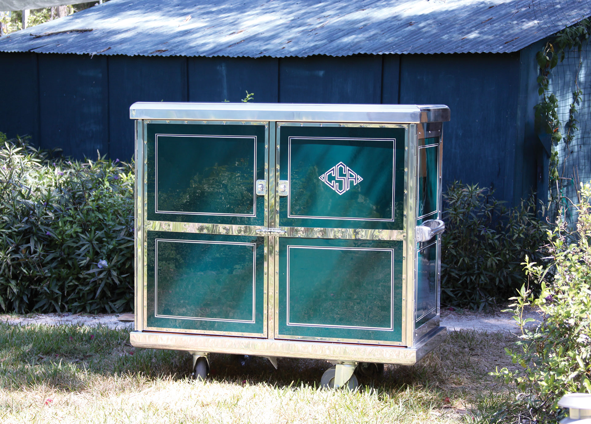 The Dressage Vertical is designed for Dressage saddles and bridles with a top lined section for polos, medicines, your wallet, cell phone, etc. The bridle racks slide in and out for easy access.