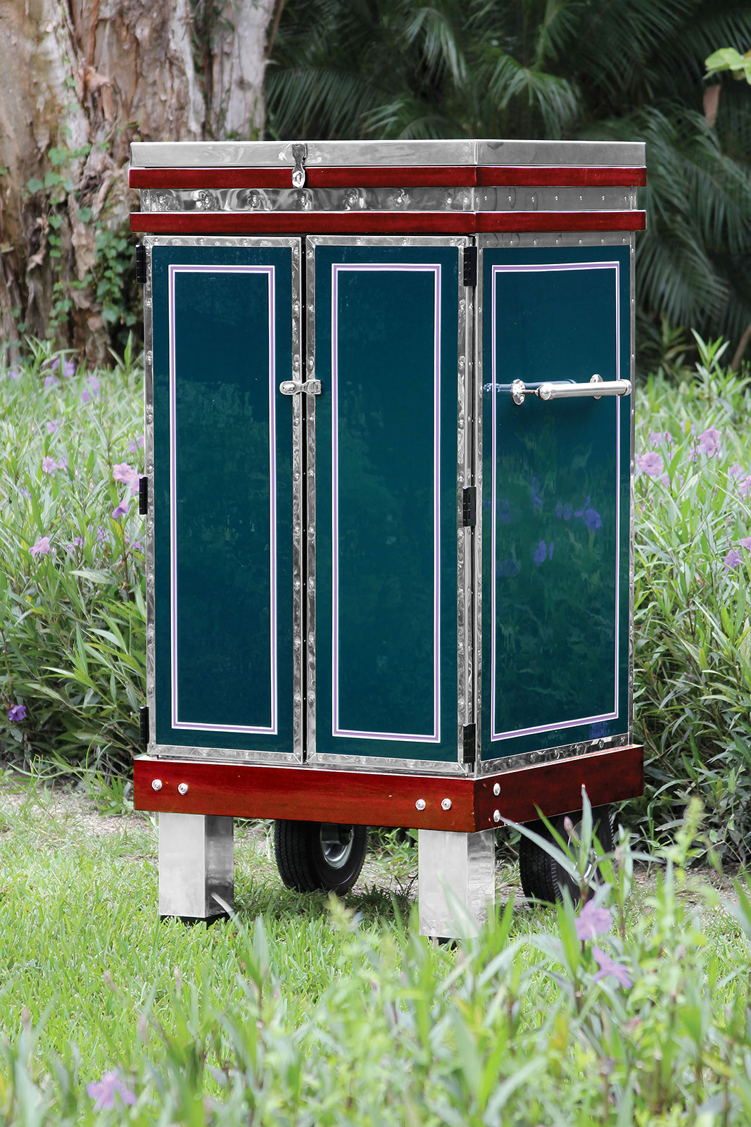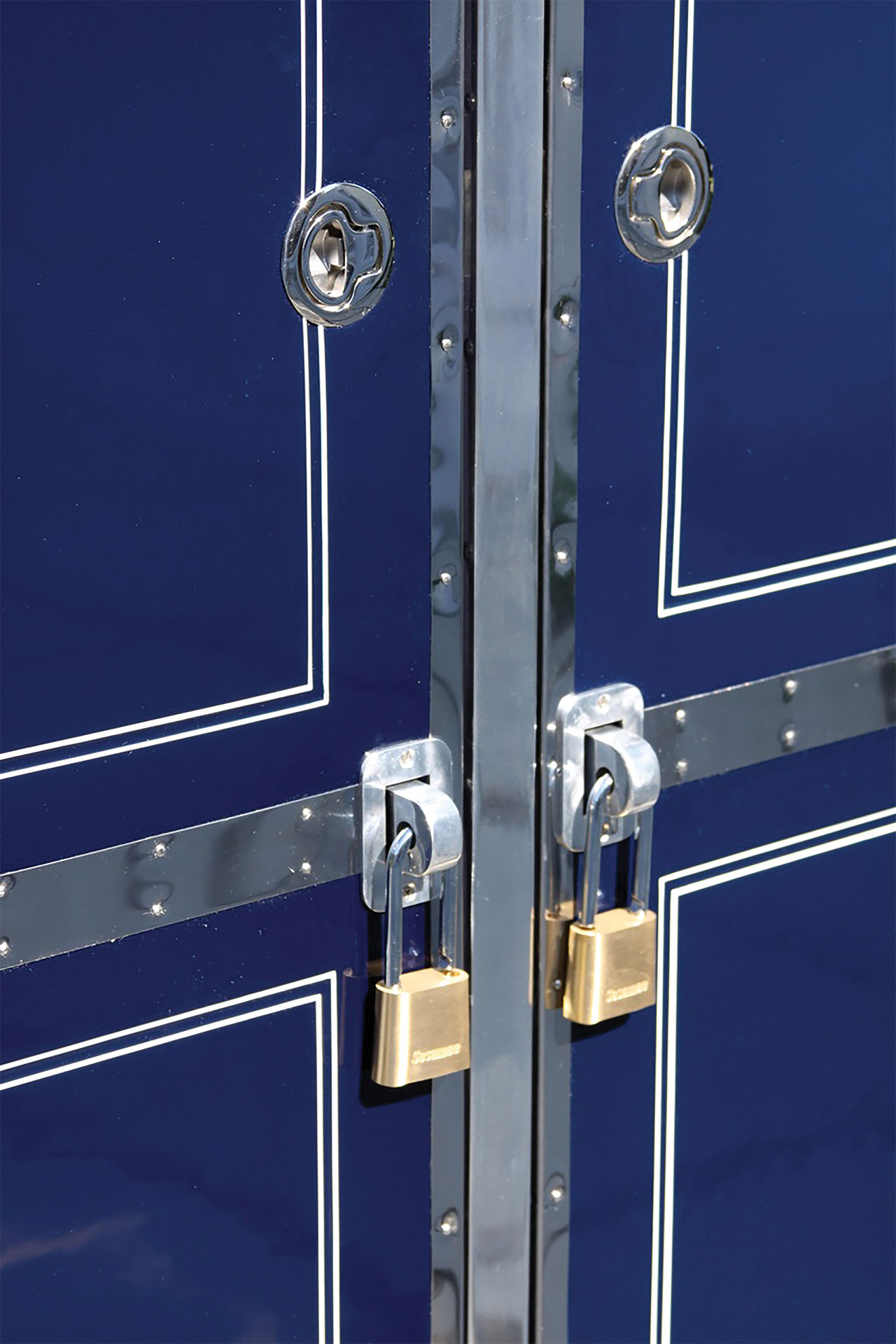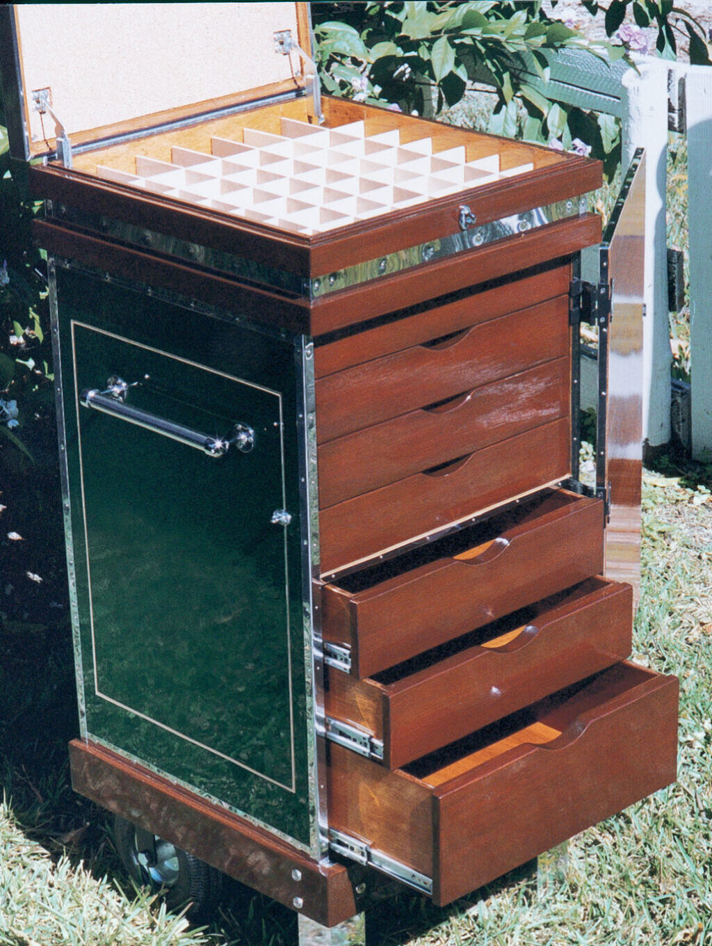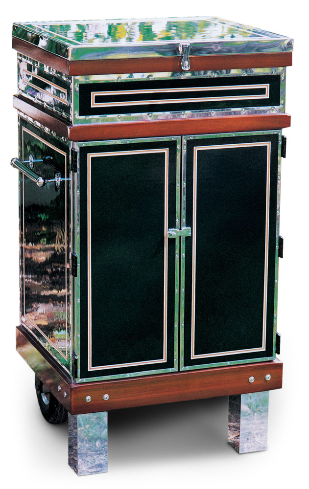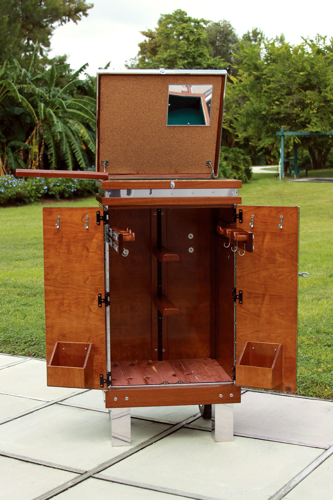 The Double Airplane Box will hold most everything you need for 2 or 3 horses in the FEI tent. It is convenient to work out of on a daily basis at home or at the shows. The interior of the Airplane Box can be arranged and made out of any material you like.